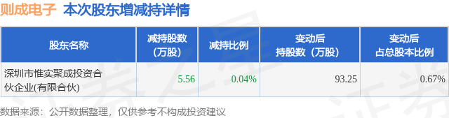 证券之星消息,1月14日则成电子发布公告《则成电子:员工持股平台减持股份结果公告》,其股东深圳市惟实聚成投资合伙企业(有限合伙)于2026年1月13日合计减持5.56万股,占公司目前总股本的0.0402%,变动期间该股股价下跌3.74%,截止1月13日收盘报27.02元。