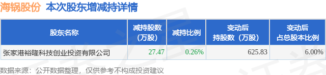 证券之星消息,1月14日海锅股份发布公告《海锅股份:关于持股5%以上股东减持股份触及1%整数倍的公告》,其股东张家港裕隆科技创业投资有限公司于2025年11月14日至2026年1月14日间合计减持27.47万股,占公司目前总股本的0.2632%,变动期间该股股价下跌5.56%,截止1月14日收盘报25.3元。