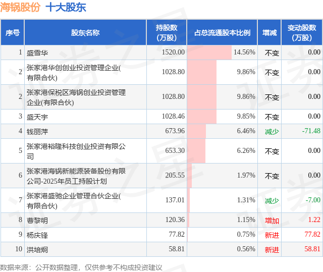 根据海锅股份2025年三季报公布的十大股东详情如下: