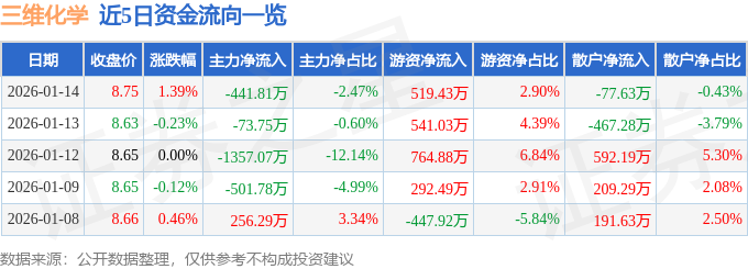 证券之星消息,截至2026年1月14日收盘,三维化学(002469)报收于8.75元,上涨1.39%,换手率3.26%,成交量20.49万手,成交额1.79亿元。