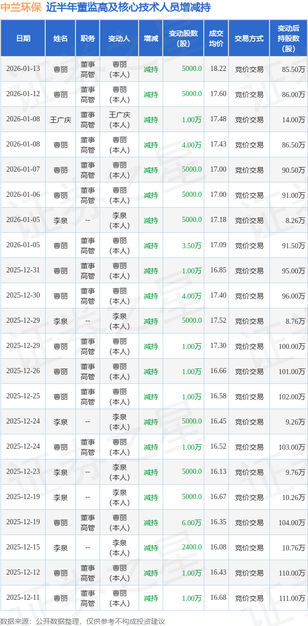 中兰环保近半年内的董监高及核心技术人员增减持详情如下: