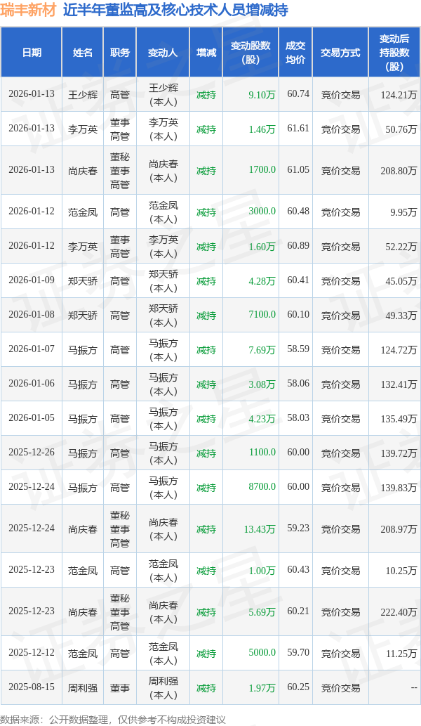 瑞丰新材近半年内的董监高及核心技术人员增减持详情如下: