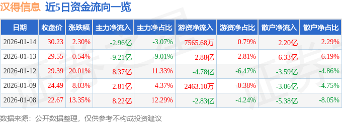 证券之星消息,截至2026年1月14日收盘,汉得信息(300170)报收于30.23元,上涨2.3%,换手率31.7%,成交量309.76万手,成交额96.28亿元。