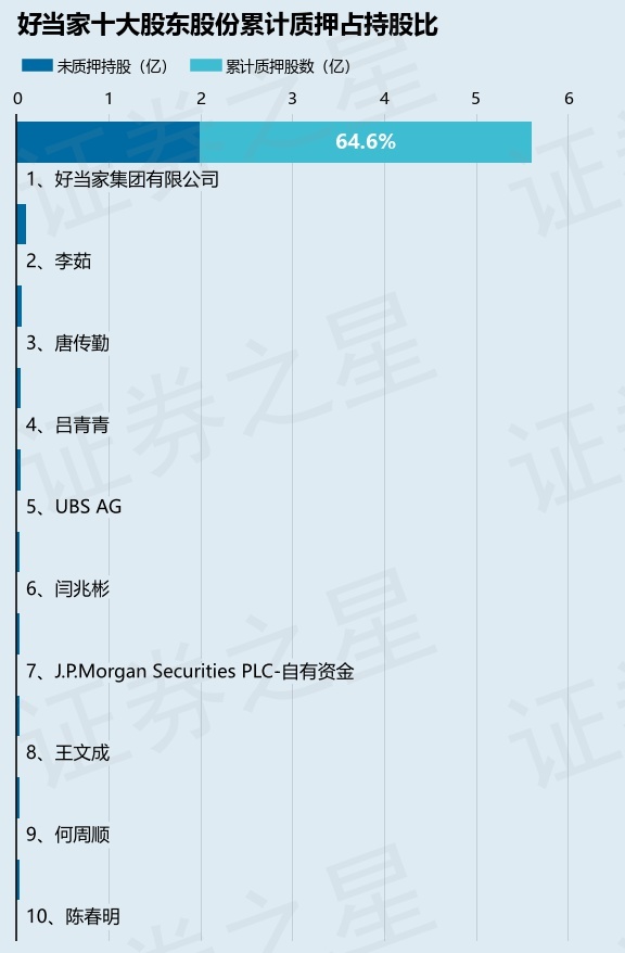 截止本公告日,股东好当家集团有限公司已累计质押股份3.63亿股,占其持股总数的64.6%。本次质押后好当家十大股东的累计质押股份占持股比例(占持股比例的计算以公司最新一期财务报表公布的十大股东的持股总数为基准)见下图: