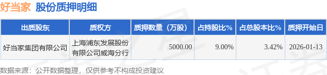 证券之星消息,好当家(600467)1月15日公开信息显示,股东好当家集团有限公司向上海浦东发展股份有限公司威海分行合计质押5000.0万股,占总股本3.42%。质押详情见下表: