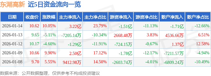证券之星消息,截至2026年1月14日收盘,东湖高新(600133)报收于10.62元,上涨10.05%,涨停,换手率12.33%,成交量131.41万手,成交额13.54亿元。