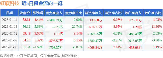 证券之星消息,截至2026年1月14日收盘,虹软科技(688088)报收于58.61元,上涨4.44%,换手率7.14%,成交量28.66万手,成交额17.01亿元。