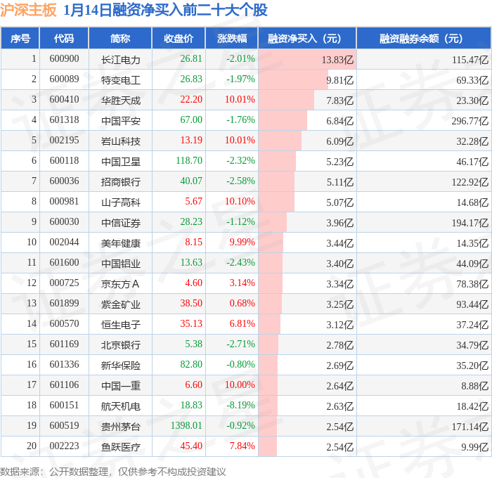 沪深主板融资净买入前三分别为:长江电力(600900)融资净买入13.83亿元、特变电工(600089)融资净买入9.81亿元、华胜天成(600410)融资净买入7.83亿元,前20具体见下表: