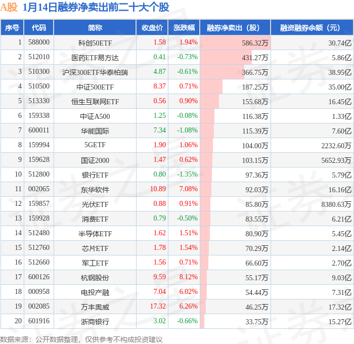 A股融券净卖出前三分别为:科创50ETF(588000)融券净卖出586.32万股、医药ETF易方达(512010)融券净卖出431.27万股、沪深300ETF华泰柏瑞(510300)融券净卖出366.75万股,前20具体见下表: