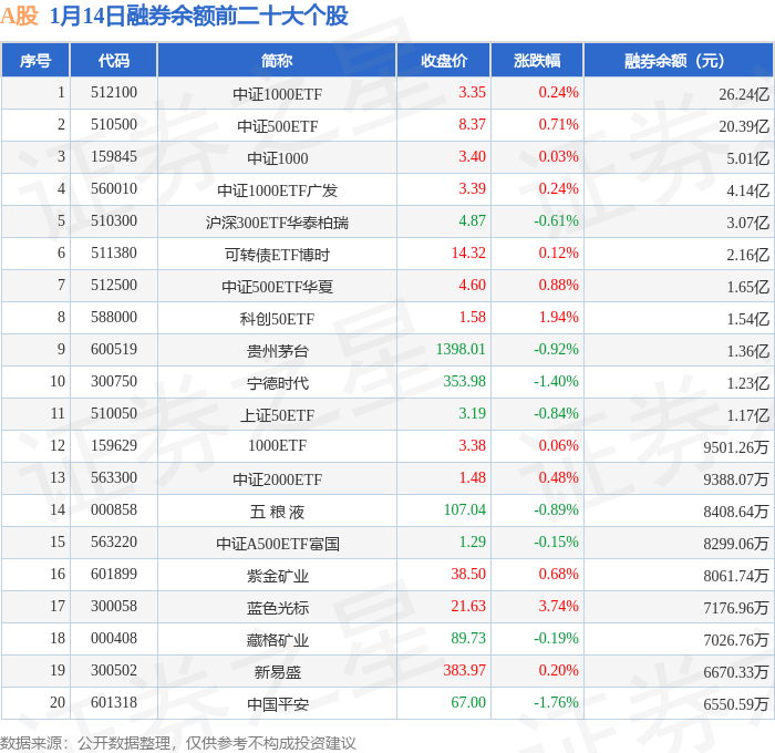 A股融券余额前三分别为:中证1000ETF(512100)融券余额26.24亿元、中证500ETF(510500)融券余额20.39亿元、中证1000(159845)融券余额5.01亿元,前20具体见下表: