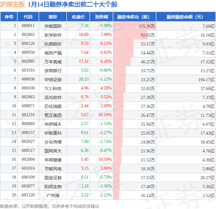 沪深主板融券净卖出前三分别为:华能国际(600011)融券净卖出115.39万股、东华软件(002065)融券净卖出92.03万股、杭钢股份(600126)融券净卖出55.17万股,前20具体见下表:
