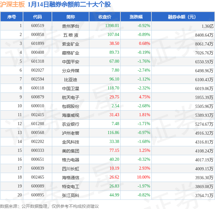 沪深主板融券余额前三分别为:贵州茅台(600519)融券余额1.36亿元、五 粮 液(000858)融券余额8408.64万元、紫金矿业(601899)融券余额8061.74万元,前20具体见下表: