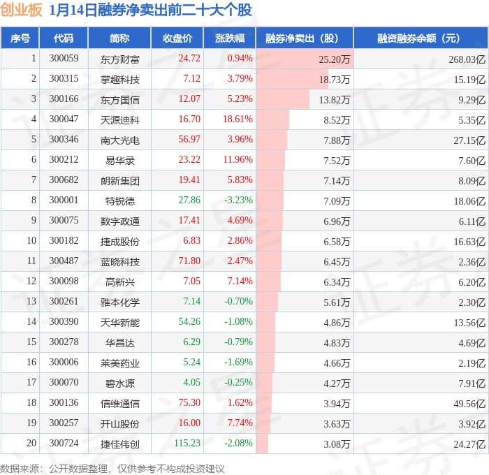 创业板融券净卖出前三分别为:东方财富(300059)融券净卖出25.2万股、掌趣科技(300315)融券净卖出18.73万股、东方国信(300166)融券净卖出13.82万股,前20具体见下表: