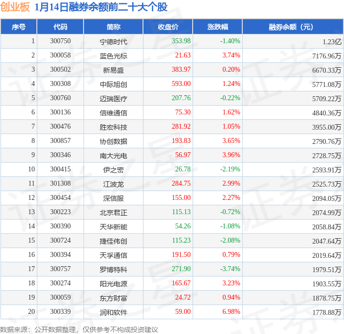 创业板融券余额前三分别为:宁德时代(300750)融券余额1.23亿元、蓝色光标(300058)融券余额7176.96万元、新易盛(300502)融券余额6670.33万元,前20具体见下表: