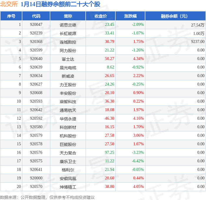 北交所融券余额前三分别为:诺思兰德(920047)融券余额27.54万元、长虹能源(920239)融券余额1万元、连城数控(920368)融券余额9237元,前20具体见下表: