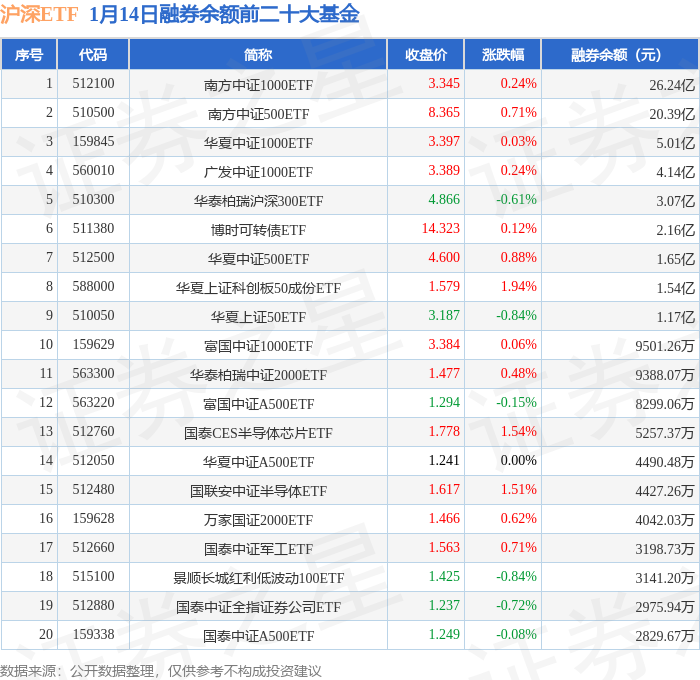 沪深ETF融券余额前三分别为:南方中证1000ETF(512100)融券余额26.24亿元、南方中证500ETF(510500)融券余额20.39亿元、华夏中证1000ETF(159845)融券余额5.01亿元,前20具体见下表: