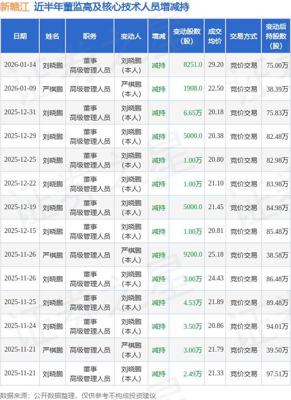 新赣江近半年内的董监高及核心技术人员增减持详情如下: