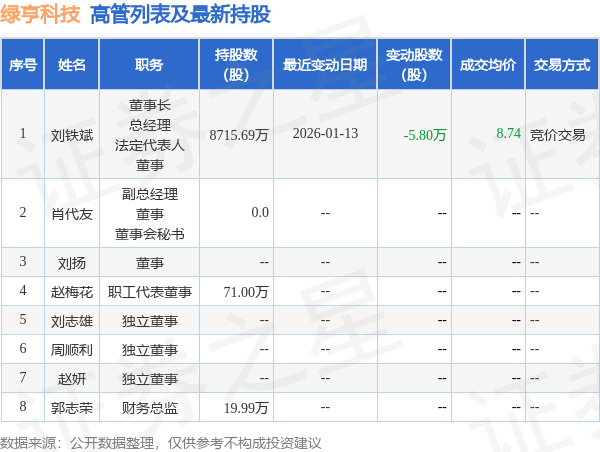 证券之星消息,根据1月15日市场公开信息、上市公司公告及交易所披露数据整理,绿亨科技(920866)最新董监高及相关人员股份变动情况:2026年1月14日公司董事,高级管理人员刘铁斌共减持公司股份34.34万股,占公司总股本为0.1906%。变动期间公司股价上涨0.93%,1月14日当日收盘报8.65元。