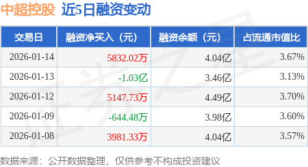 证券之星消息,1月14日,中超控股(002471)融资买入2.15亿元,融资偿还1.57亿元,融资净买入5832.02万元,融资余额4.04亿元。