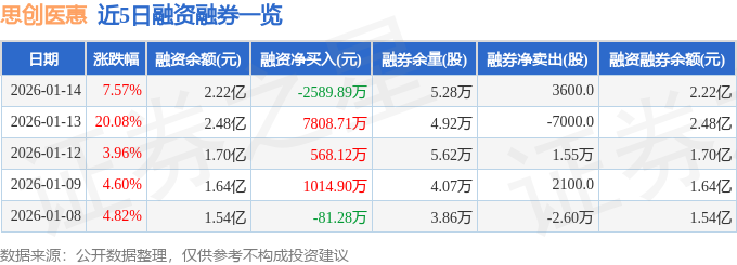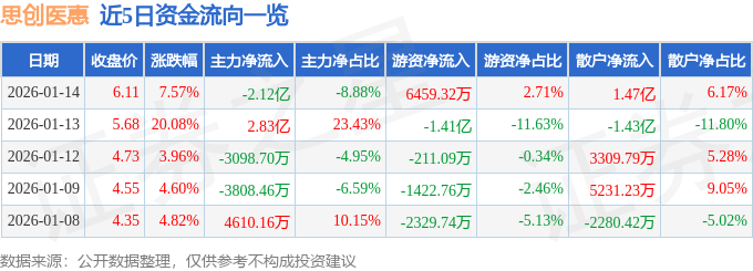 证券之星消息,截至2026年1月14日收盘,思创医惠(300078)报收于6.11元,上涨7.57%,换手率34.88%,成交量388.31万手,成交额23.84亿元。