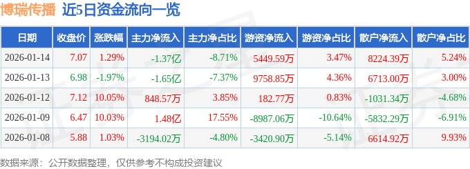 1月14日的资金流向数据方面,主力资金净流出1.37亿元,占总成交额8.71%,游资资金净流入5449.59万元,占总成交额3.47%,散户资金净流入8224.39万元,占总成交额5.24%。