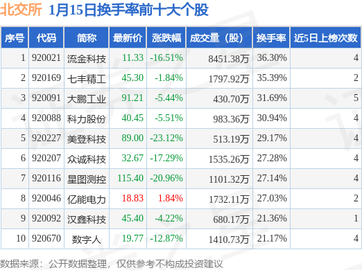 当日北交所换手率前10大个股中1只个股收涨,平均涨幅1.84%,其中流金科技(920021)以换手率36.3%排第一,9只个股近5个交易日中多次上榜。