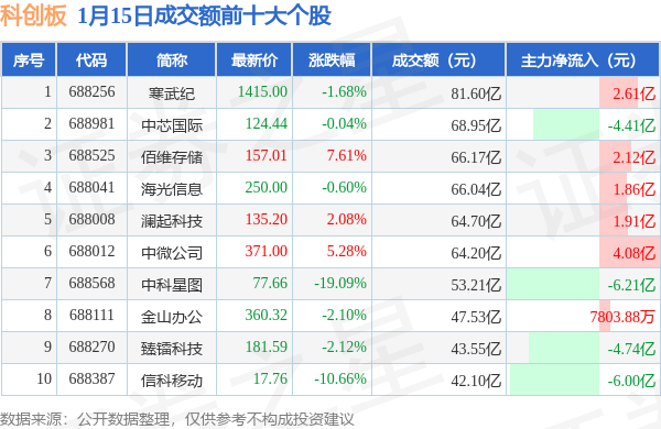 当日科创板成交额前10大个股中3只个股收涨,平均涨幅4.99%,其中寒武纪(688256)以成交额81.6亿元排第一。从主力资金流入看,成交额前10大个股中有6只个股呈现主力资金净流入。
