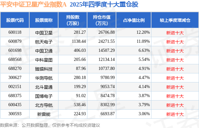 根据2025基金年报公募基金重仓股数据,重仓该股的公募基金共4家,其中持有数量最多的公募基金为平安基金的平安中证卫星产业指数A。平安中证卫星产业指数A目前规模为2.48亿元,最新净值1.5276(1月14日),较上一交易日下跌0.12%。该公募基金现任基金经理为翁欣 马浩然。翁欣在任的基金产品包括:平安中证港股通医药卫生综合ETF,管理时间为2023年12月15日至今,期间收益率为45.98%;平安中证港股医药ETF联接A,管理时间为2023年12月27日至今,期间收益率为53.56%;平安中证畜牧养殖ETF,管理时间为2023年12月27日至今,期间收益率为-0.26%;平安医药及医疗器械创新ETF,管理时间为2023年12月27日至今,期间收益率为-3.63%。马浩然在任的基金产品包括:平安中证新能车ETF联接A,管理时间为2025年10月20日至今,期间收益率为11.48%;平安中证光伏产业指数A,管理时间为2025年10月20日至今,期间收益率为13.12%;平安中证汽车零部件主题ETF联接A,管理时间为2025年10月20日至今,期间收益率为13.15%;平安中证汽车零部件主题ETF,管理时间为2025年10月20日至今,期间收益率为14.23%。