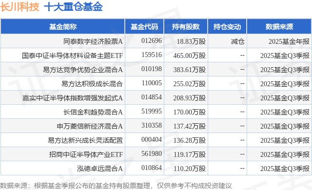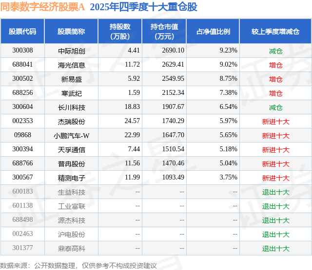 根据2025基金年报公募基金重仓股数据,重仓该股的公募基金共1家,其中持有数量最多的公募基金为同泰基金的同泰数字经济股票A。同泰数字经济股票A目前规模为0.55亿元,最新净值1.3003(1月14日),较上一交易日上涨3.39%,近一年上涨97.4%。该公募基金现任基金经理为陈宗超。陈宗超在任的基金产品包括:同泰行业优选股票A,管理时间为2023年4月7日至今,期间收益率为-15.69%;同泰慧利混合A,管理时间为2025年5月12日至今,期间收益率为45.27%;同泰新能源1年持有股票A,管理时间为2025年5月12日至今,期间收益率为77.32%。
