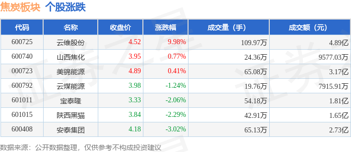 证券之星消息,1月15日焦炭板块较上一交易日上涨0.28%,云维股份领涨。当日上证指数报收于4112.6,下跌0.33%。深证成指报收于14306.73,上涨0.41%。焦炭板块个股涨跌见下表: