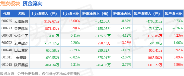 从资金流向上来看,当日焦炭板块主力资金净流入8566.48万元,游资资金净流出7494.59万元,散户资金净流出1071.89万元。焦炭板块个股资金流向见下表:
