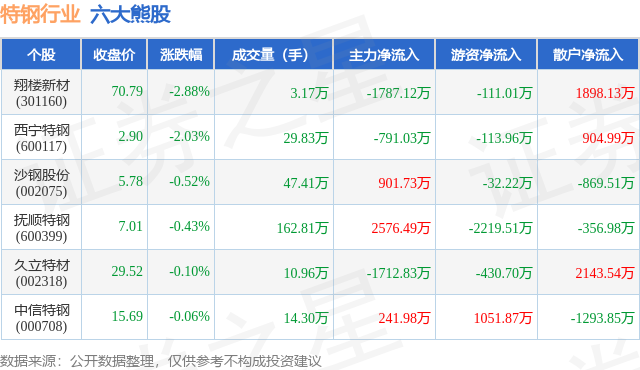 个股表现方面,特钢行业当日领跌股为翔楼新材(301160),该股当日报收70.79,下跌2.88%,成交量3.17万,主力资金净流出1787.12万元。西宁特钢(600117)以下跌2.03%紧随其后,该股当日成交量29.83万,主力资金净流出791.03万元。除此之外,沙钢股份(002075)、抚顺特钢(600399)、久立特材(002318)均进入当日熊股之列。具体个股列表见下表: