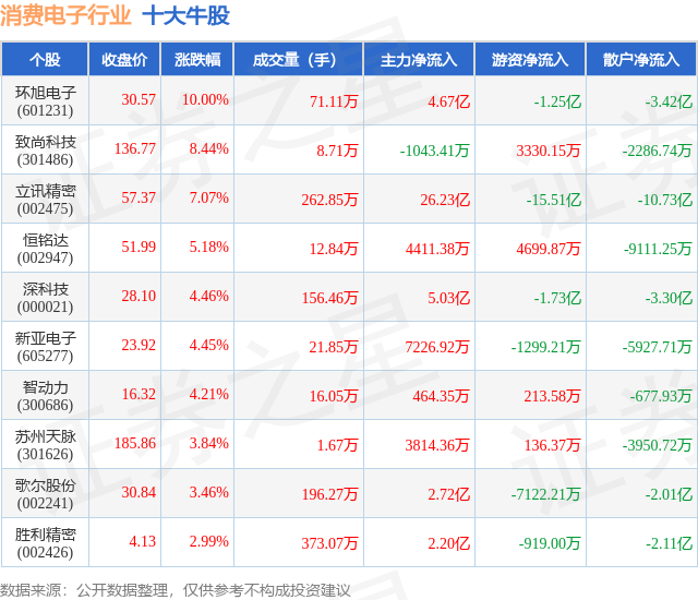 个股表现方面,消费电子行业当日领涨股为环旭电子(601231),该股当日报收30.57,上涨10.0%,成交量71.11万,主力资金净流入4.67亿元。致尚科技(301486)以上涨8.44%紧随其后,该股当日成交量8.71万,主力资金净流出1043.41万元。除此之外,立讯精密(002475)、恒铭达(002947)、深科技(000021)均进入当日牛股之列。具体个股列表见下表: