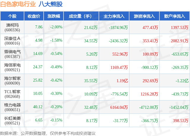个股表现方面,白色家电行业当日领跌股为澳柯玛(600336),该股当日报收7.86,下跌2.0%,成交量21.62万,主力资金净流出1874.96万元。深康佳A(000016)以下跌1.58%紧随其后,该股当日成交量34.55万,主力资金净流出2436.32万元。除此之外,雪祺电气(001387)、海信家电(000921)、海尔智家(600690)均进入当日熊股之列。具体个股列表见下表: