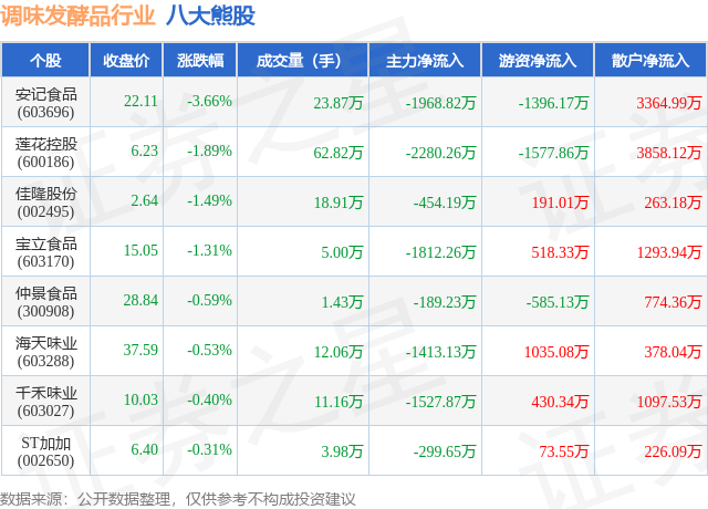 个股表现方面,调味发酵品行业当日领跌股为安记食品(603696),该股当日报收22.11,下跌3.66%,成交量23.87万,主力资金净流出1968.82万元。莲花控股(600186)以下跌1.89%紧随其后,该股当日成交量62.82万,主力资金净流出2280.26万元。除此之外,佳隆股份(002495)、宝立食品(603170)、仲景食品(300908)均进入当日熊股之列。具体个股列表见下表: