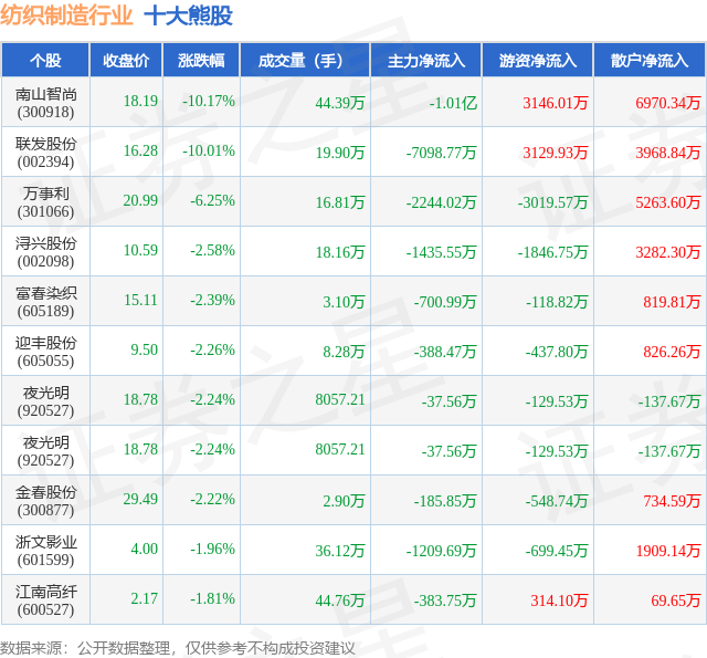个股表现方面,纺织制造行业当日领跌股为南山智尚(300918),该股当日报收18.19,下跌10.17%,成交量44.39万,主力资金净流出1.01亿元。联发股份(002394)以下跌10.01%紧随其后,该股当日成交量19.9万,主力资金净流出7098.77万元。除此之外,万事利(301066)、浔兴股份(002098)、富春染织(605189)均进入当日熊股之列。具体个股列表见下表: