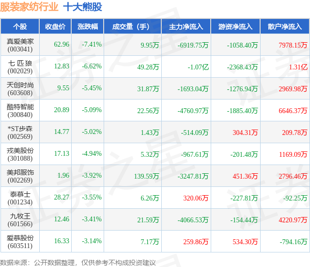 个股表现方面,服装家纺行业当日领跌股为真爱美家(003041),该股当日报收62.96,下跌7.41%,成交量9.95万,主力资金净流出6919.75万元。七 匹 狼(002029)以下跌6.62%紧随其后,该股当日成交量49.28万,主力资金净流出1.07亿元。除此之外,天创时尚(603608)、酷特智能(300840)、*ST步森(002569)均进入当日熊股之列。具体个股列表见下表: