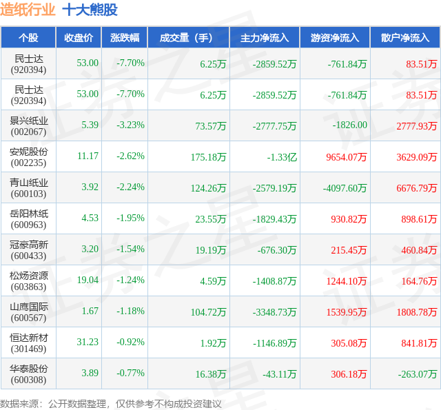 个股表现方面,造纸行业当日领跌股为民士达(920394),该股当日报收53.0,下跌7.7%,成交量6.25万,主力资金净流出2859.52万元。民士达(920394)以下跌7.7%紧随其后,该股当日成交量6.25万,主力资金净流出2859.52万元。除此之外,景兴纸业(002067)、安妮股份(002235)、青山纸业(600103)均进入当日熊股之列。具体个股列表见下表: