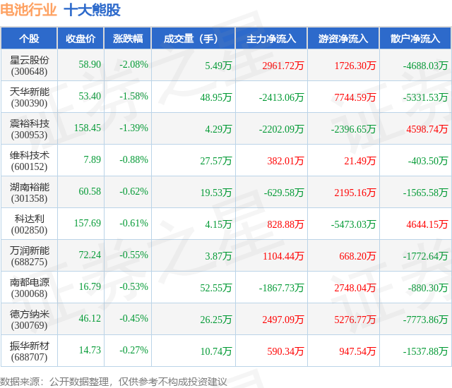 个股表现方面,电池行业当日领跌股为星云股份(300648),该股当日报收58.9,下跌2.08%,成交量5.49万,主力资金净流入2961.72万元。天华新能(300390)以下跌1.58%紧随其后,该股当日成交量48.95万,主力资金净流出2413.06万元。除此之外,震裕科技(300953)、维科技术(600152)、湖南裕能(301358)均进入当日熊股之列。具体个股列表见下表: