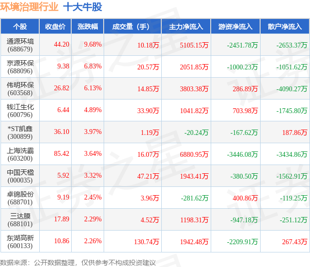 个股表现方面,环境治理行业当日领涨股为通源环境(688679),该股当日报收44.2,上涨9.68%,成交量10.18万,主力资金净流入5105.15万元。京源环保(688096)以上涨6.83%紧随其后,该股当日成交量20.57万,主力资金净流入2051.85万元。除此之外,伟明环保(603568)、钱江生化(600796)、*ST凯鑫(300899)均进入当日牛股之列。具体个股列表见下表:
