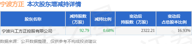 证券之星消息,1月15日宁波方正发布公告《宁波方正:关于控股股东、实际控制人及其一致行动人权益变动触及1%整数倍的公告》,其股东宁波兴工方正控股有限公司于2026年1月14日合计减持92.79万股,占公司目前总股本的0.6765%,变动期间该股股价下跌0.37%,截止1月14日收盘报23.99元。