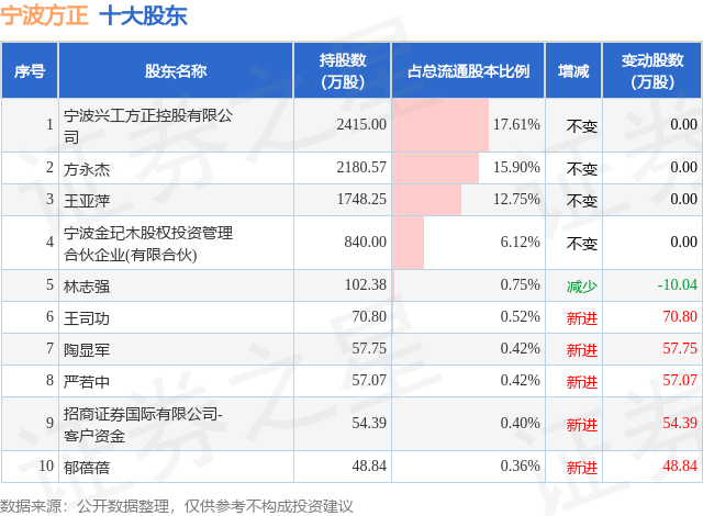 根据宁波方正2025年三季报公布的十大股东详情如下: