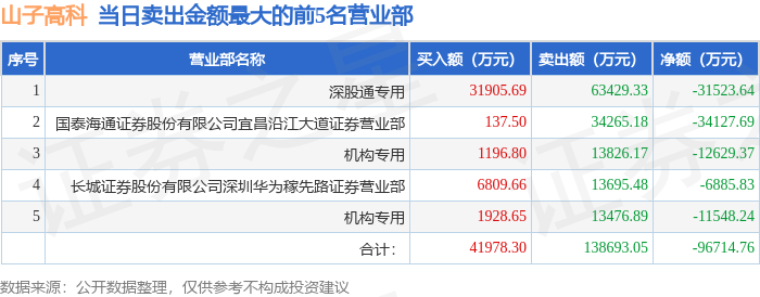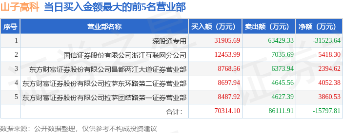 证券之星消息,沪深交易所2026年1月15日公布的交易公开信息显示,山子高科(000981)因日跌幅偏离值达到7%的前5只证券登上龙虎榜。此次是近5个交易日内第3次上榜。