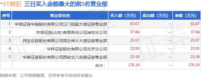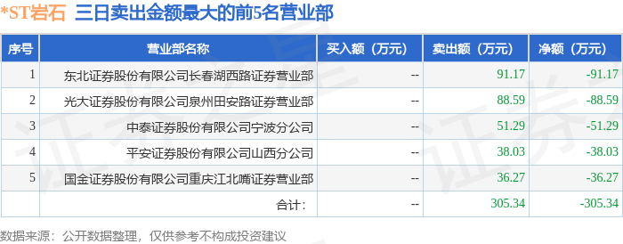 证券之星消息,沪深交易所2026年1月15日公布的交易公开信息显示,*ST岩石(600696)因ST、*ST证券连续三个交易日内收盘价格跌幅偏离值累计达到12%的证券登上龙虎榜。此次是近5个交易日内第2次上榜。
