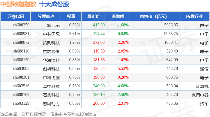 中型综指(000020)指数十大成份股详情如下: