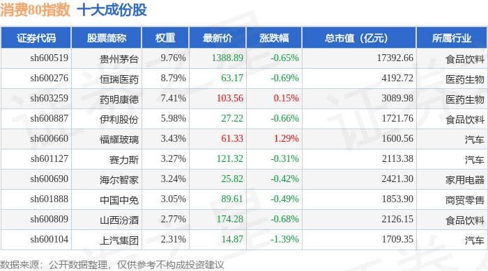 消费80(000069)指数十大成份股详情如下: