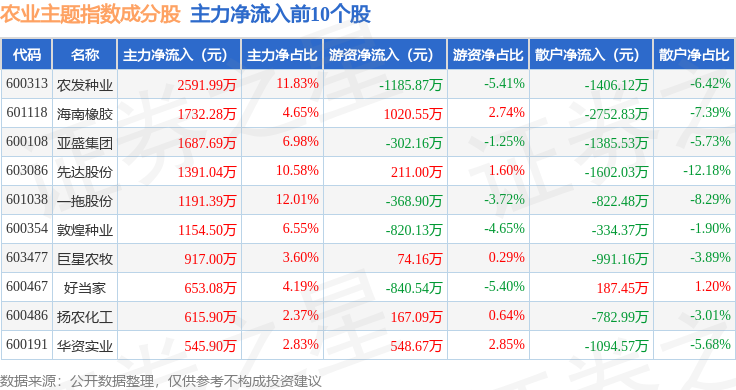 资金流向方面,农业主题(000122)指数成份股当日主力资金净流入合计1669.53万元,游资资金净流入合计4486.28万元,散户资金净流出合计6155.81万元。成份股资金流向详情见下表: