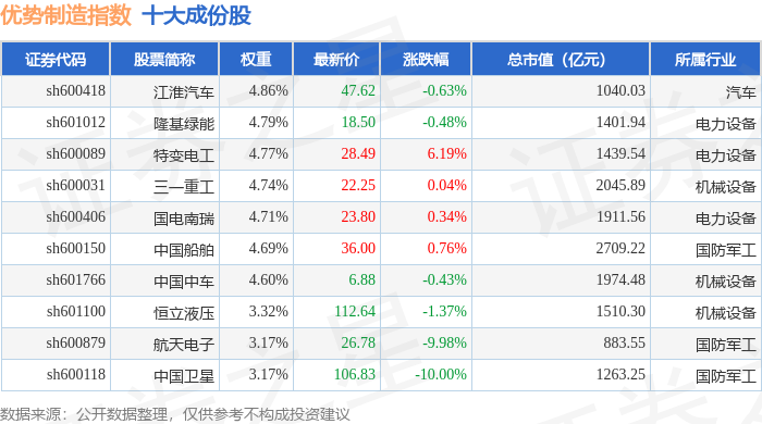 证券之星消息,1月15日,优势制造(000146)指数报收于8532.37点,跌0.49%,成交1035.14亿元,换手率2.54%。当日该指数成份股中,上涨的有21家,洪都航空以9.29%的涨幅领涨,下跌的有27家,中国卫星以10.0%的跌幅领跌。