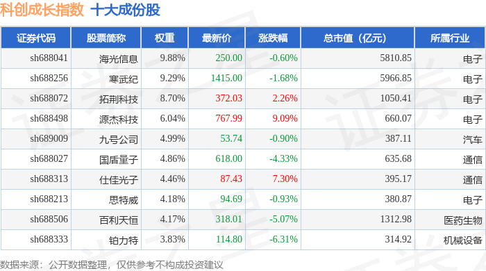 科创成长(000690)指数十大成份股详情如下: