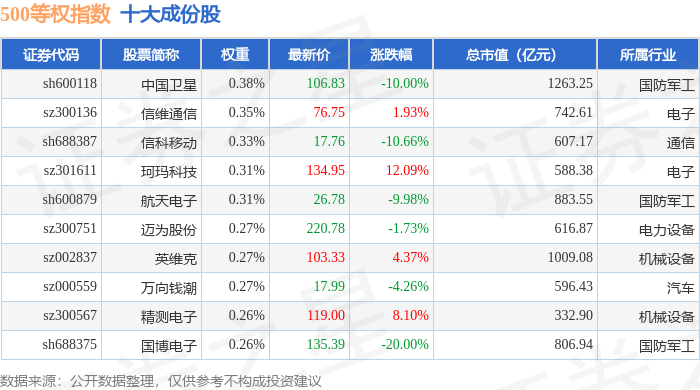 500等权(000982)指数十大成份股详情如下: